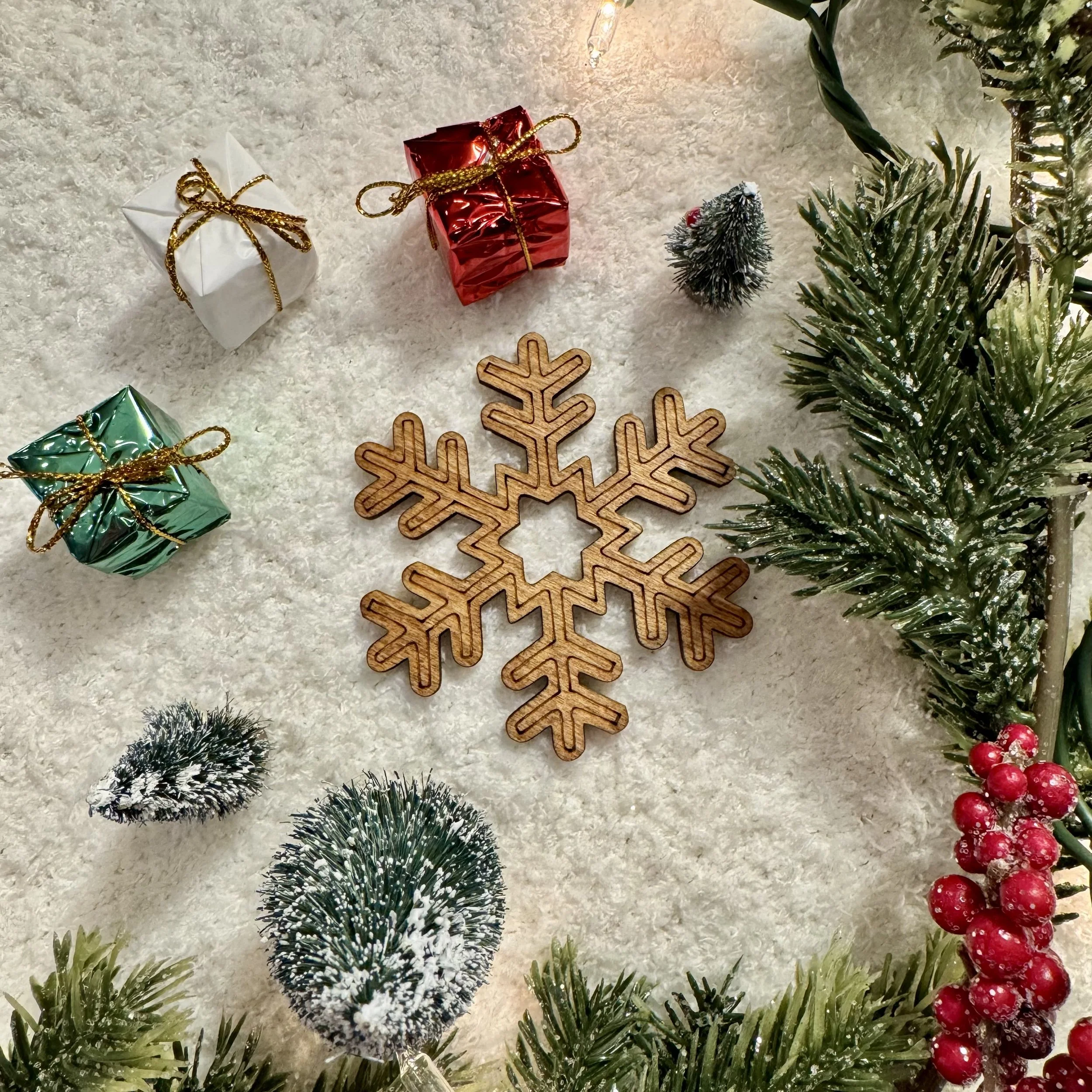 Decorative Christmas display with a large wooden snowflake ornament, small wrapped presents, snow-covered miniature Christmas trees, greenery, and red berries on a snowy background.